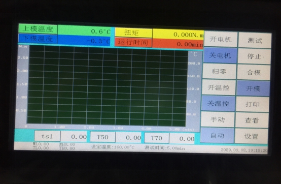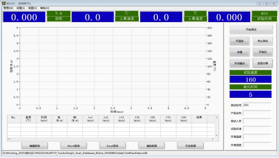 隨著硫化開始,膠料試樣的剛度增大,測力機(jī)構(gòu)測出的反作用力(力矩)會逐步上升到穩(wěn)定值或**值并通過屏幕逐漸顯示出來,同時看到一條力矩與時間的對應(yīng)關(guān)系曲線圖,通常稱為“硫化曲線”。曲線的形狀和試驗溫度與膠料的特性有關(guān)。試驗結(jié)束后,數(shù)據(jù)、曲線將自動存儲到數(shù)據(jù)庫中,如果需要打印,直接點擊“打印”即可。